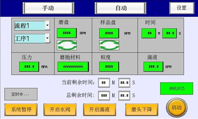 2) 單工序模式:根據每一步磨拋工序,可設置和調用30種工序參數:磨盤和磨頭轉動速度、磨拋時間、水通斷……